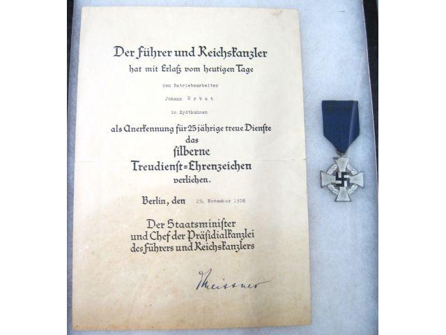 A 25 year cilvilian long service medal with his 1938 award document from Eydtkuhnen, a town on the Russian/Lithuanian border and and the most eastern part of Prussia.  Unusual award area.