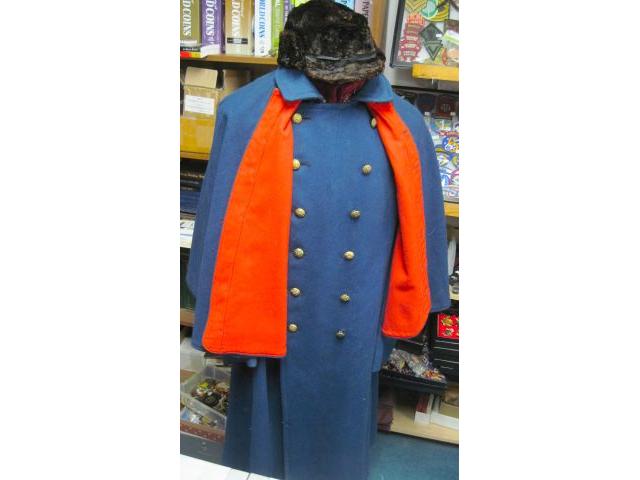 Heavy artilleryman's overcoat and red cape from the 1900 era. Heavy wool. Comes with old cloth/fur visor cap worn for warmth.