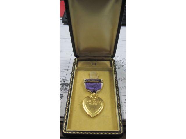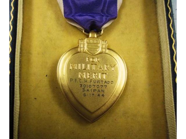 WWII Purple Heart for PFC H. Furtado who was wounded on Saipan June 17,1944. 3 piece construction with slot brooch mount. In original box, No other medals or paperwork.