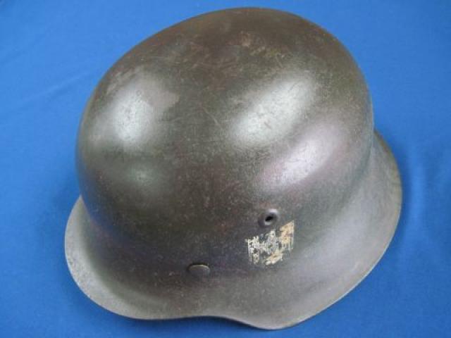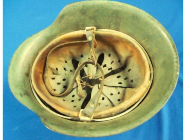Solid M42 helmet with full original liner and chinstrap. Decal about 50%. Traces of spraypaint on liner, etc. Displays well at a good price!