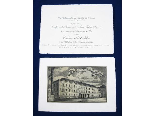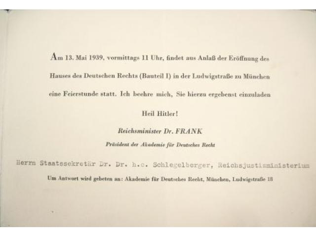 1939 invitation to the opening of the House of German law in Munich issued to Dr. Schlegelberger who was State Secretary to the Ministry of Justice. He was the highest ranking defendant at the Nurnburg trials. Invitation sent by Hans Frank.